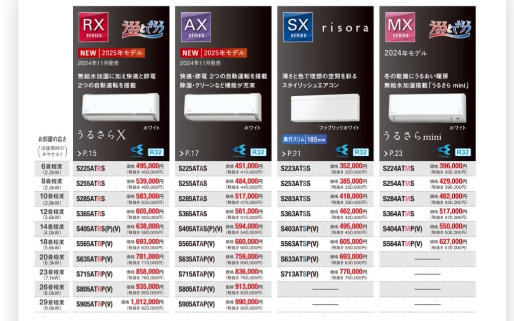 カタログをしっかり理解すると6畳用、10畳用、14畳用(200V)だけで事足りることに気付く。