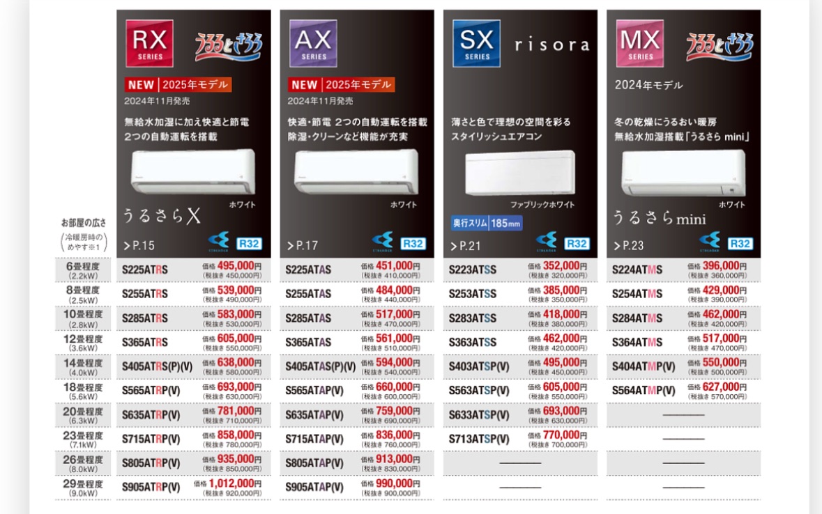 ダイキンのカタログより。仕入れ値は大体8掛けだそう。ネットで買ったり量販店で買う場合はこの価格では売れないので実際目にする価格はもっと安い。マイホームを買う際は施工業者からエアコンの設置を薦められるこれに近い価格で。利益率高いから向こうも必死。しかも家のお世話になるから断りづらい。勇気を持って断ろう!