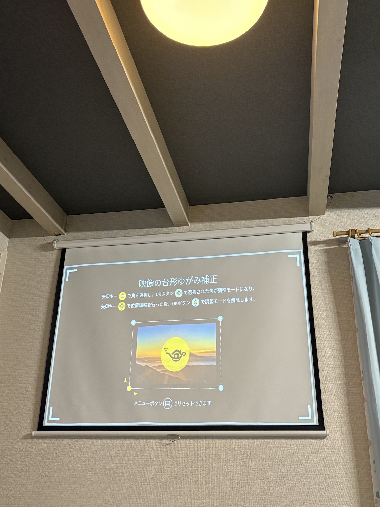 また再発防止としてスクリーンの下げ位置を子どもの手の届きづらい位置までさらに上げました。それでも73インチくらいで投影できてます。
