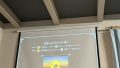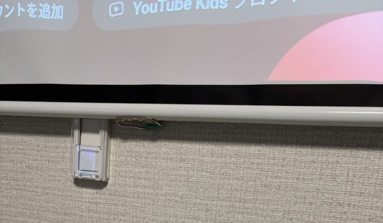 スクリーンももっと下まで下げれば大画面で投影できるけど手が届かないギリギリのところで調整。